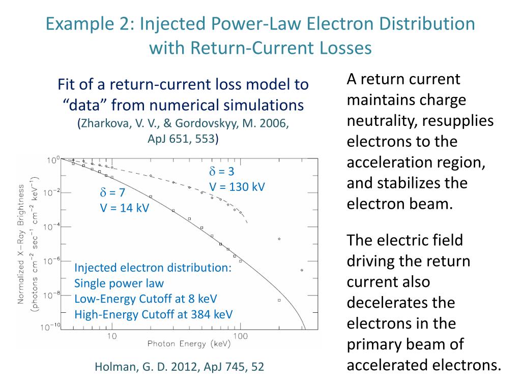 Example 2: Injected Power-Law Electron Distribution with Return-Current Losses A return current maintains charge neutrality, resupplies electrons to the acceleration region, and stabilizes the electron beam. The electric field driving the return current also decelerates the electrons in the primary beam of accelerated electrons. Fit of a return-current loss model to “data” from numerical simulations (Zharkova, V. V., & Gordovskyy, M. 2006,ApJ 651, 553) = 3V = 130 kV = 7V = 14 kV Injected electron distribution:Single power lawLow-Energy Cutoff at 8 keVHigh-Energy Cutoff at 384 keV Holman, G. D. 2012, ApJ 745, 52