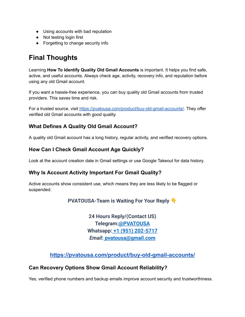 ● Using accounts with bad reputation ● Not testing login first ● Forgetting to change security info Final Thoughts Learning How To Identify Quality Old Gmail Accounts is important. It helps you find safe, active, and useful accounts. Always check age, activity, recovery info, and reputation before using any old Gmail account. If you want a hassle-free experience, you can buy quality old Gmail accounts from trusted providers. This saves time and risk. For a trusted source, visit https://pvatousa.com/product/buy-old-gmail-accounts/. They offer verified old Gmail accounts with good quality. What Defines A Quality Old Gmail Account? A quality old Gmail account has a long history, regular activity, and verified recovery options. How Can I Check Gmail Account Age Quickly? Look at the account creation date in Gmail settings or use Google Takeout for data history. Why Is Account Activity Important For Gmail Quality? Active accounts show consistent use, which means they are less likely to be flagged or suspended. PVATOUSA-Team is Waiting For Your Reply ? 24 Hours Reply/(Contact US) Telegram:@PVATOUSA Whatsapp: +1 (951) 202-5717 Email: pvatousa@gmail.com https://pvatousa.com/product/buy-old-gmail-accounts/ Can Recovery Options Show Gmail Account Reliability? Yes, verified phone numbers and backup emails improve account security and trustworthiness.