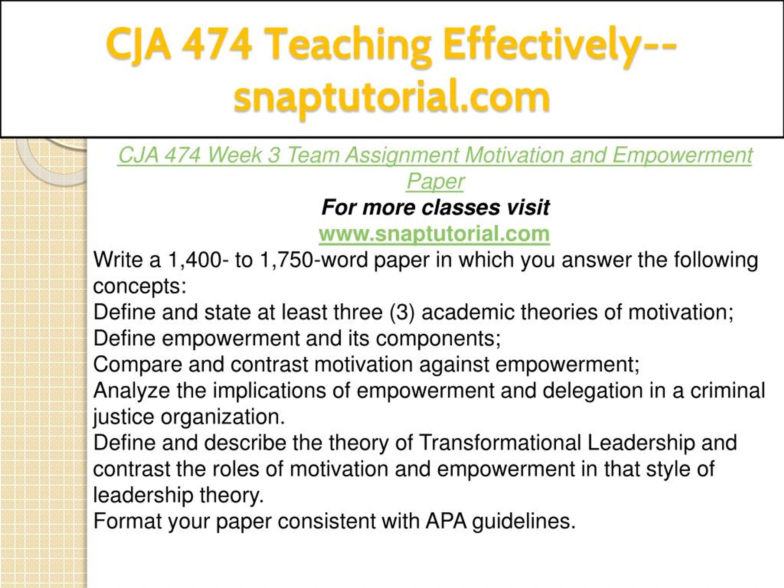 CJA 474 Teaching Effectively--snaptutorial.com CJA 474 Week 2 Motivation and theories (1000 words, New Syllabus) For more classes visit www.snaptutorial.com CJA 474 Week 2 Motivation and theories (900 words, New Syllabus)