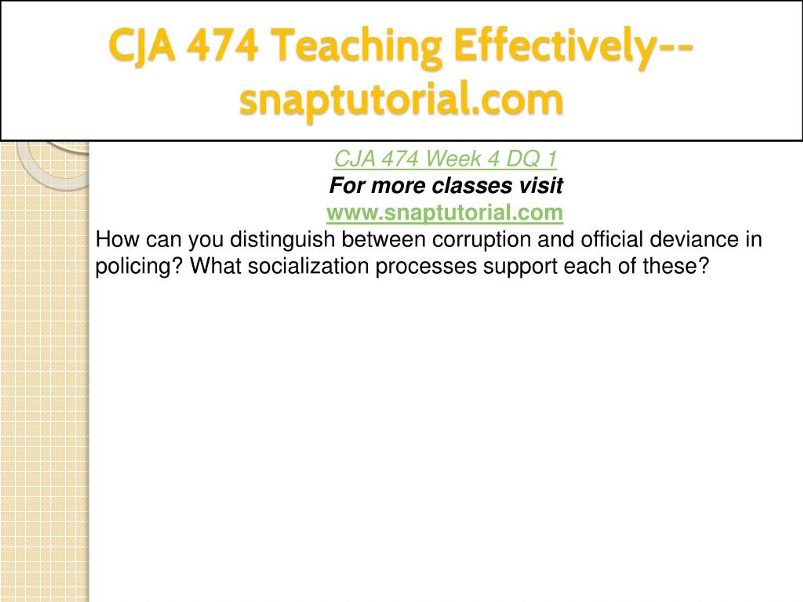 CJA 474 Teaching Effectively--snaptutorial.com CJA 474 Week 4 DQ 1 For more classes visit www.snaptutorial.com How can you distinguish between corruption and official deviance in policing? What socialization processes support each of these?