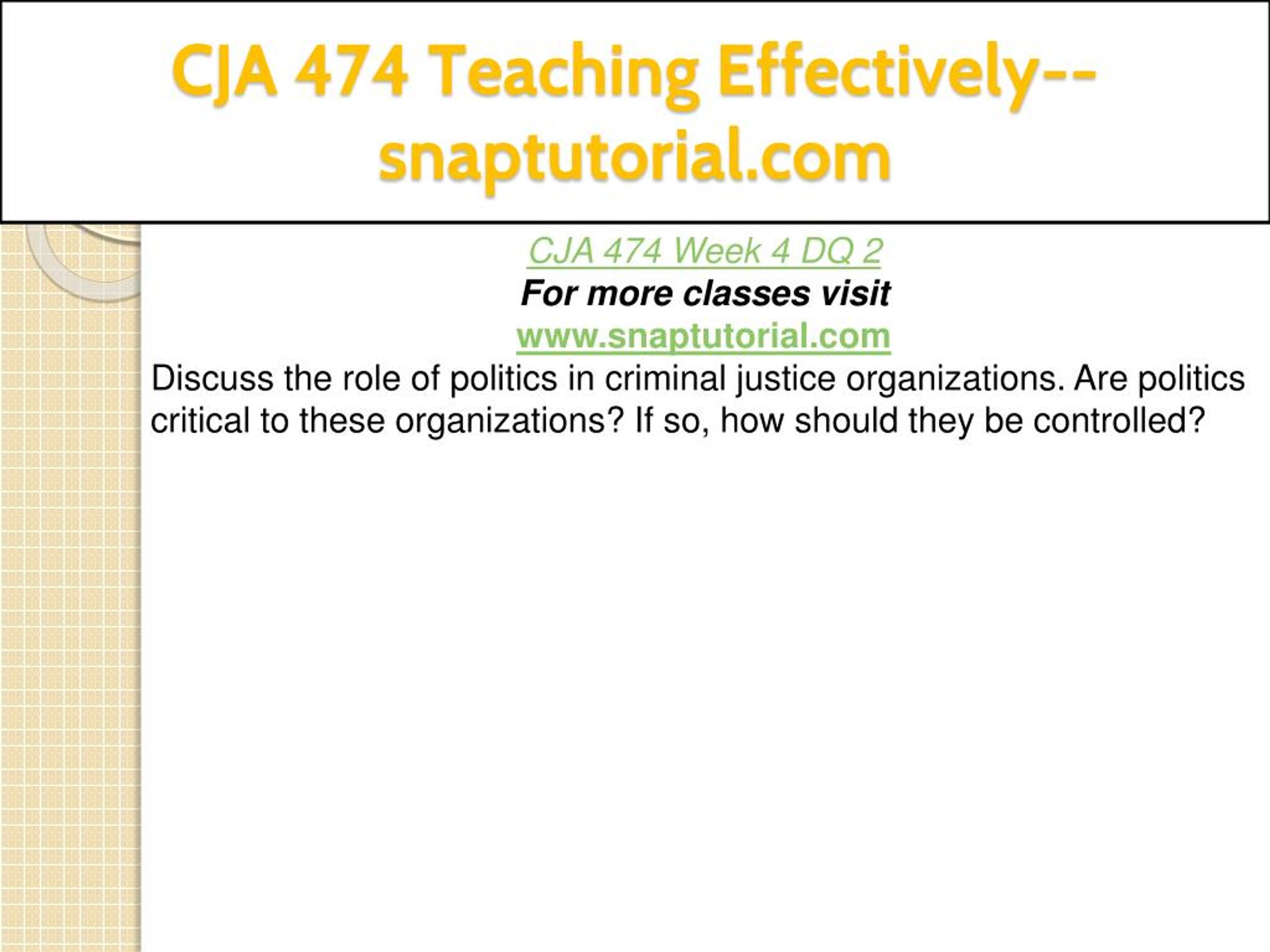 CJA 474 Teaching Effectively--snaptutorial.com CJA 474 Week 4 DQ 2 For more classes visit www.snaptutorial.com Discuss the role of politics in criminal justice organizations. Are politics critical to these organizations? If so, how should they be controlled?