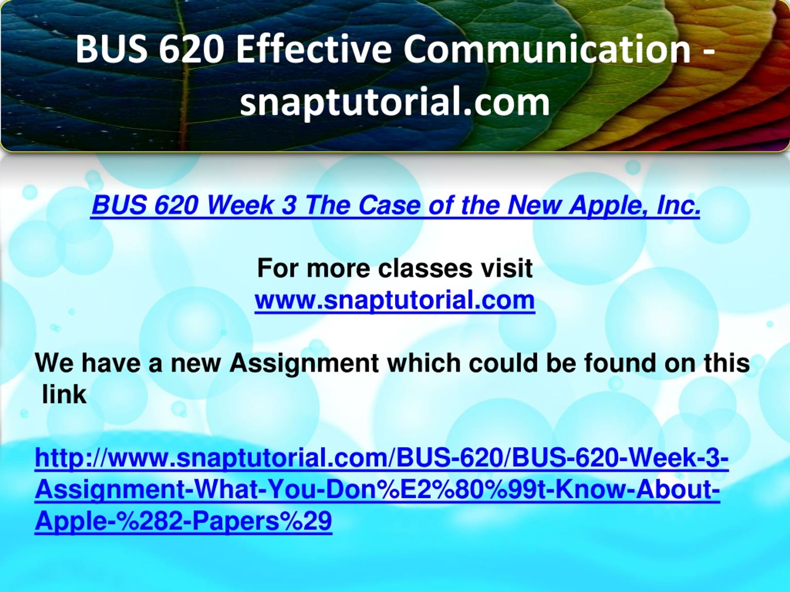BUS 620 Effective Communication - snaptutorial.com BUS 620 Week 3 The Case of the New Apple, Inc. For more classes visit www.snaptutorial.com We have a new Assignment which could be found on this link http://www.snaptutorial.com/BUS-620/BUS-620-Week-3-Assignment-What-You-Don%E2%80%99t-Know-About-Apple-%282-Papers%29