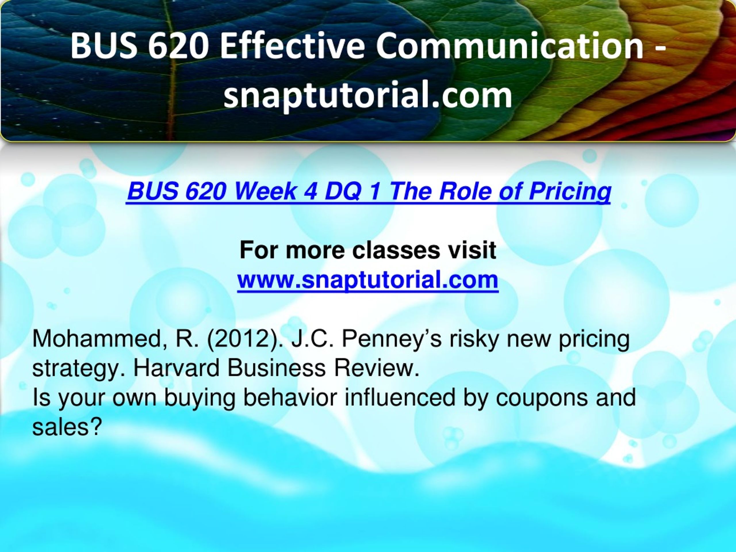 BUS 620 Effective Communication - snaptutorial.com BUS 620 Week 4 DQ 1 The Role of Pricing For more classes visit www.snaptutorial.com Mohammed, R. (2012). J.C. Penney’s risky new pricing strategy. Harvard Business Review. Is your own buying behavior influenced by coupons and sales?