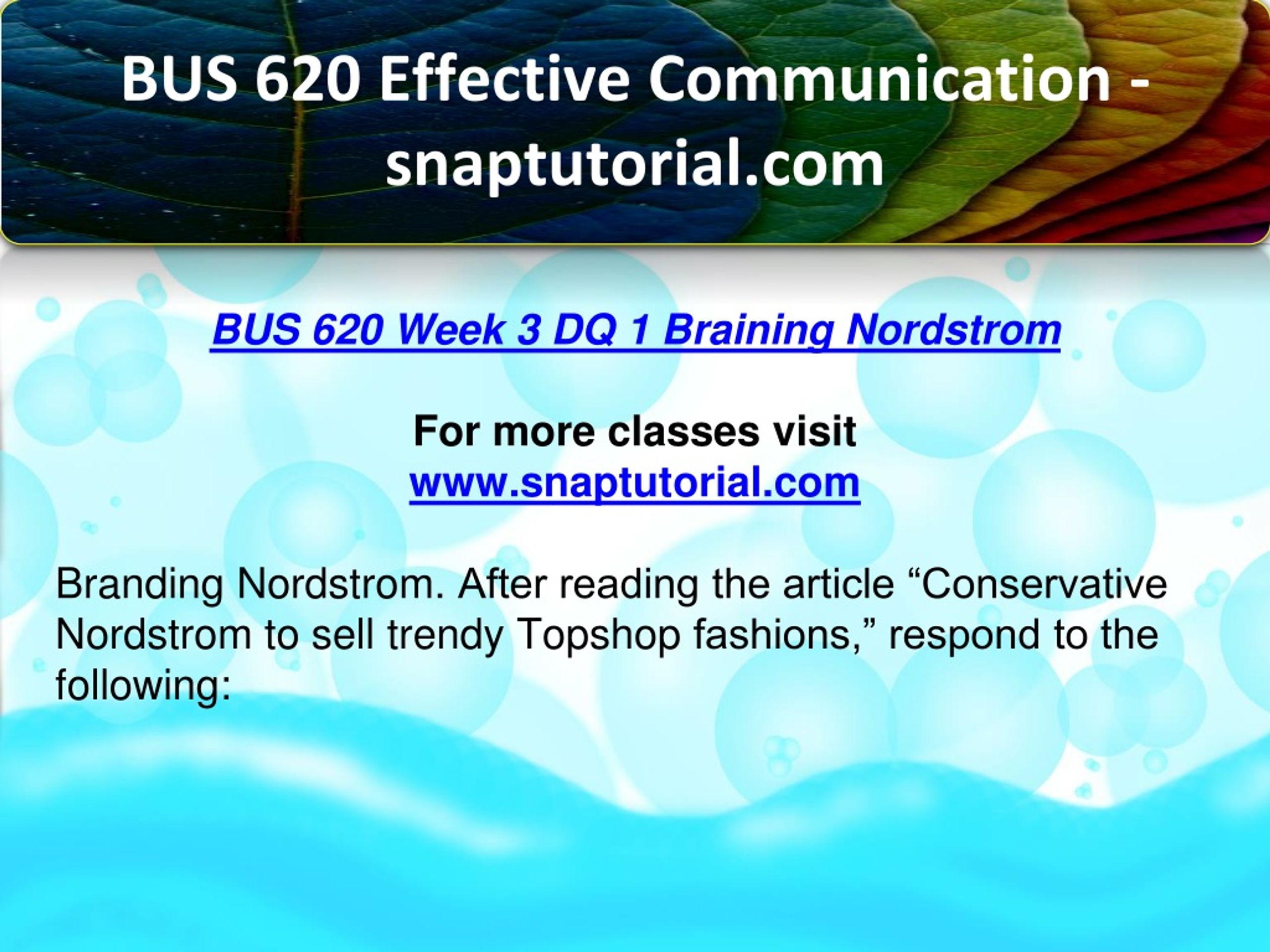 BUS 620 Effective Communication - snaptutorial.com BUS 620 Week 3 DQ 1 Braining Nordstrom For more classes visit www.snaptutorial.com Branding Nordstrom. After reading the article “Conservative Nordstrom to sell trendy Topshop fashions,” respond to the following:
