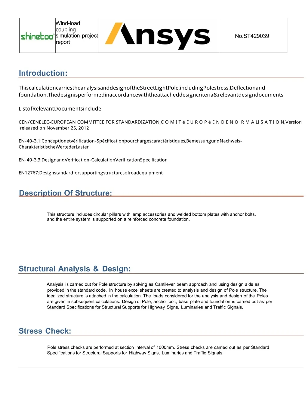 Wind-load coupling simulation project report No.ST429039 Introduction: ThiscalculationcarriestheanalysisanddesignoftheStreetLightPole,includingPolestress,Deflectionand foundation.Thedesignisperformedinaccordancewiththeattacheddesigncriteria&relevantdesigndocuments ListofRelevantDocumentsinclude: CEN/CENELEC-EUROPEAN COMMITTEE FOR STANDARDIZATION,C O M I T é E U R O P é E N D E N O R M A LI S A T I O N,Version released on November 25, 2012 EN-40-3.1:Conceptionetvérification-Spécificationpourchargescaractéristiques,BemessungundNachweis- CharakteristischeWertederLasten EN-40-3.3:DesignandVerification-CalculationVerificationSpecification EN12767:Designstandardforsupportingstructuresofroadequipment Description Of Structure: Thisstructureincludescircularpillarswithlampaccessoriesandweldedbottomplateswithanchorbolts, andtheentiresystemissupportedonareinforcedconcretefoundation. Structural Analysis & Design : Analysis is carried out for Pole structure by solving as Cantilever beam approach and using design aids as provided in the standard code. In house excel sheets are created to analysis and design of Pole structure. The idealized structure is attached in the calculation. The loads considered for the analysis and design of the Poles are given in subsequent calculations. Design of Pole, anchor bolt, base plate and foundation is carried out as per Standard Specifications for Structural Supports for Highway Signs, Luminaries and Traffic Signals. Stress Check: Pole stress checks are performed at section interval of 1000mm. Stress checks are carried out as per Standard Specifications for Structural Supports for Highway Signs, Luminaries and Traffic Signals.