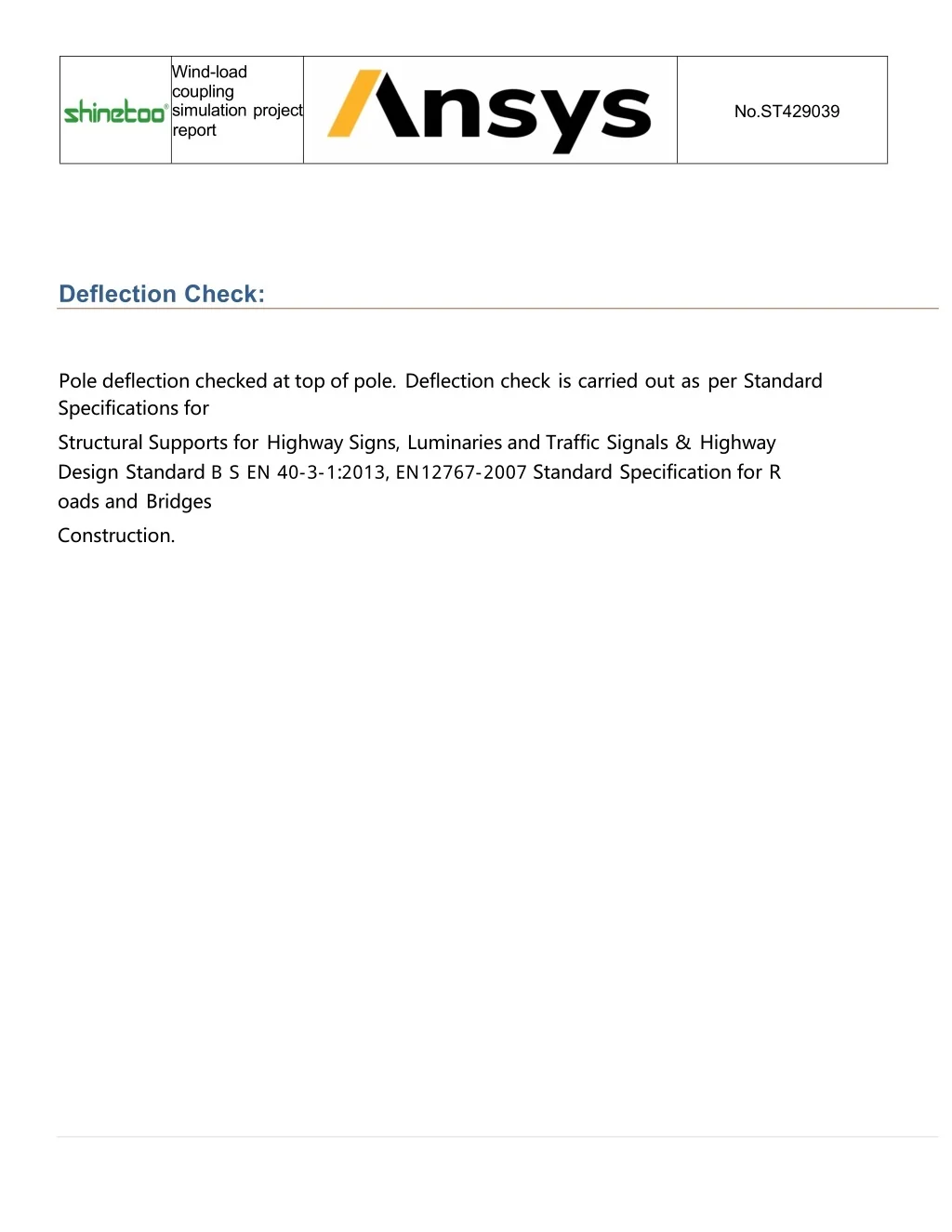 Wind-load coupling simulation project report No.ST429039 Deflection Check: Pole deflection checked at top of pole. Deflection check is carried out as per Standard Specifications for Structural Supports for Highway Signs, Luminaries and Traffic Signals & Highway Design Standard B S EN 40-3-1:2013, EN12767-2007 Standard Specification for R oads and Bridges Construction.
