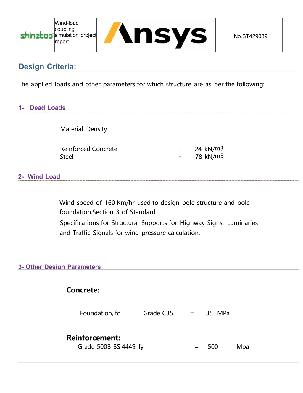 Wind-load coupling simulation project report No.ST429039 Design Criteria: The applied loads and other parameters for which structure are as per the following: 1- Dead Loads Material Densit y 24 kN/m3 78 kN/m3 Reinforced Concrete Steel = = 2- Wind Load Wind speed of 160 Km/hr used to design pole structure and pole foundation.Section 3 of Standard Specifications for Structural Supports for Highway Signs, Luminaries and Traffic Signals for wind pressure calculation. 3- Other Design Parameter s Concrete: Foundation, fc Grade C35 = 35 MPa Reinforcement: Grade 500B BS 4449, fy = 500 Mpa