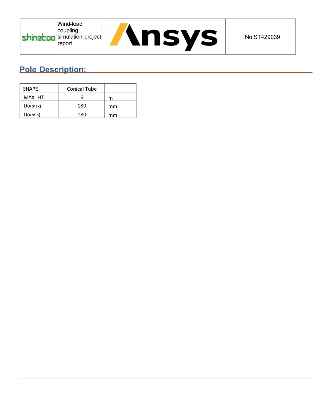 Wind-load coupling simulation project report No.ST429039 Pole Description: SHAPE MAX. HT. Do(max) Conical Tube 6 180 m mm Do(min) 180 m m