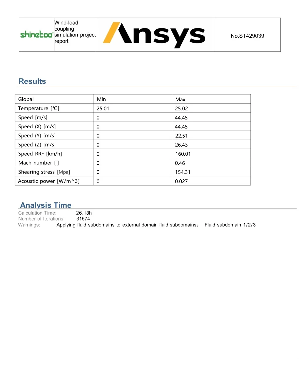 Wind-load coupling simulation project report No.ST429039 Results Global Min Max Temperature [℃] 25.01 25.02 Speed [m/s ] 0 44.45 Speed (X) [m/s ] 0 44.45 Speed (Y) [m/s ] 0 22.51 Speed (Z) [m/s ] 0 26.43 Speed RRF [km/h ] 0 160.01 Mach number [ ] 0 0.46 Shearing stress [Mpa ] 0 154.31 Acoustic power [W/m^3 ] 0 0.027 Analysis Time Calculation Time: Number of Iterations: Warnings: 26.13h 31574 Applying fluid subdomains to external domain fluid subdomains: Fluid subdomain 1/2/3