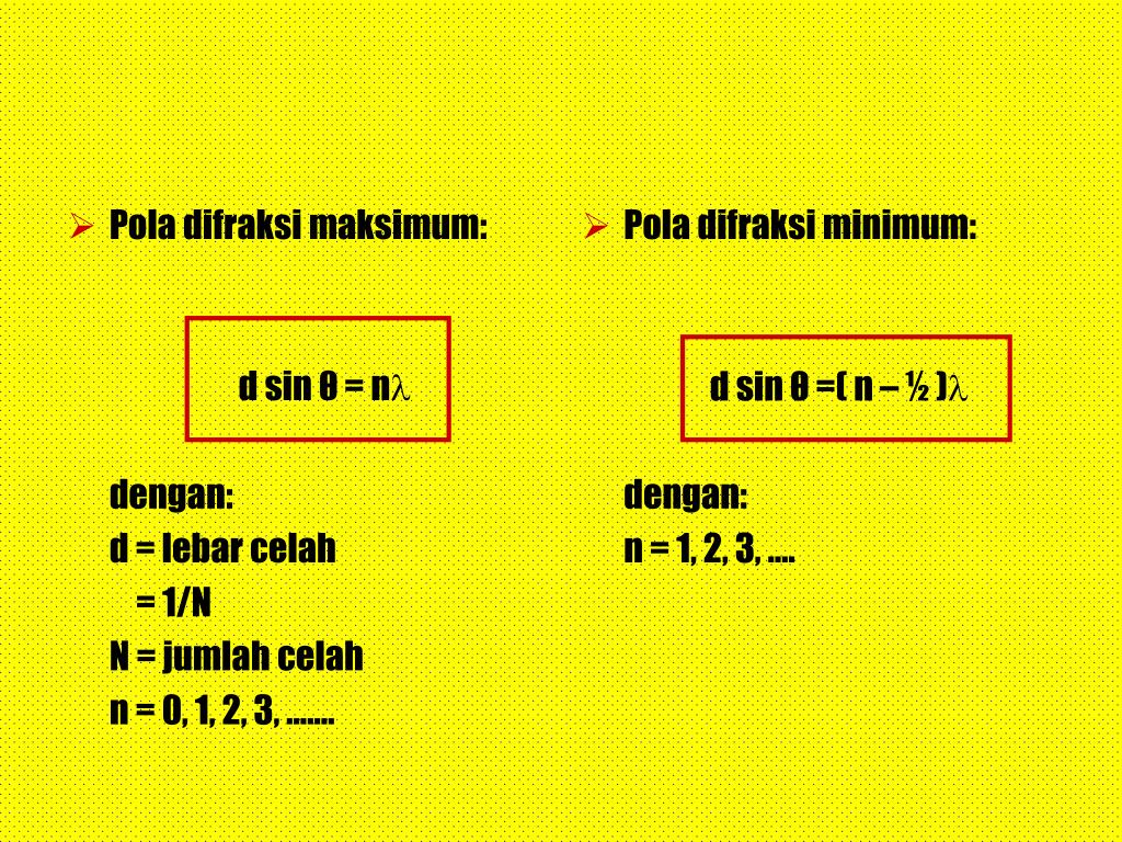 Pola difraksi maksimum: d sin θ = n dengan: d = lebar celah = 1/N N = jumlah celah n = 0, 1, 2, 3, ……. Pola difraksi minimum: d sin θ =( n – ½ ) dengan: n = 1, 2, 3, ….