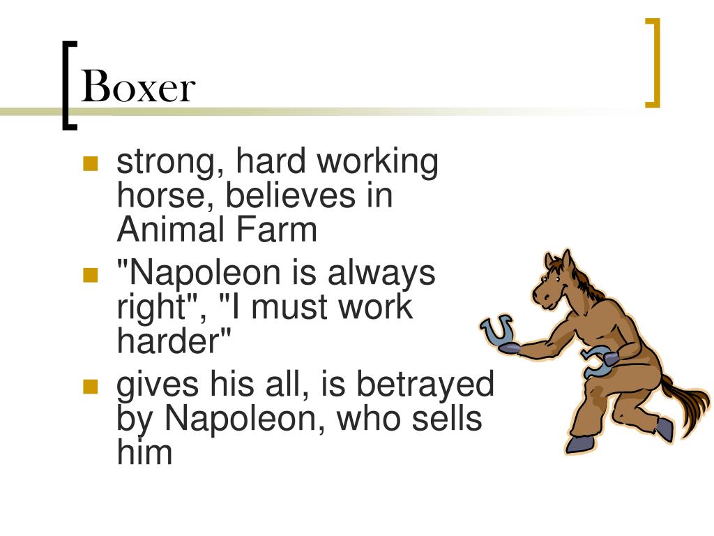 Boxer • strong, hard working horse, believes in Animal Farm • "Napoleon is always right", "I must work harder" • gives his all, is betrayed by Napoleon, who sells him