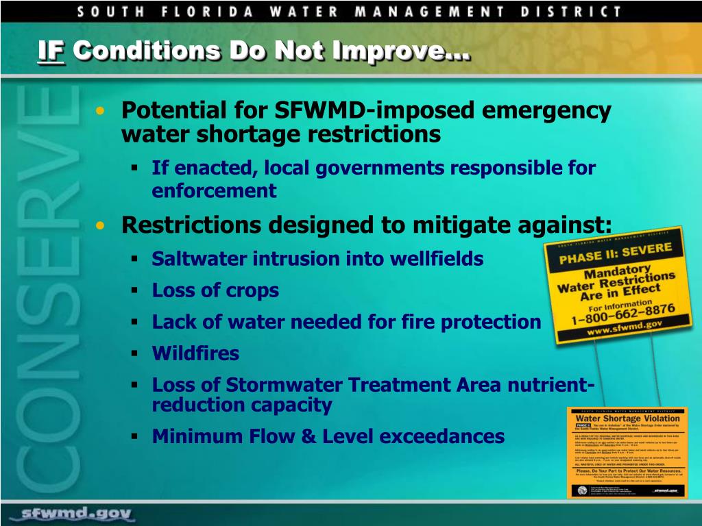 IF Conditions Do Not Improve… • Potential for SFWMD-imposed emergency water shortage restrictions • If enacted, local governments responsible for enforcement • Restrictions designed to mitigate against: • Saltwater intrusion into wellfields • Loss of crops • Lack of water needed for fire protection • Wildfires • Loss of Stormwater Treatment Area nutrient-reduction capacity • Minimum Flow & Level exceedances