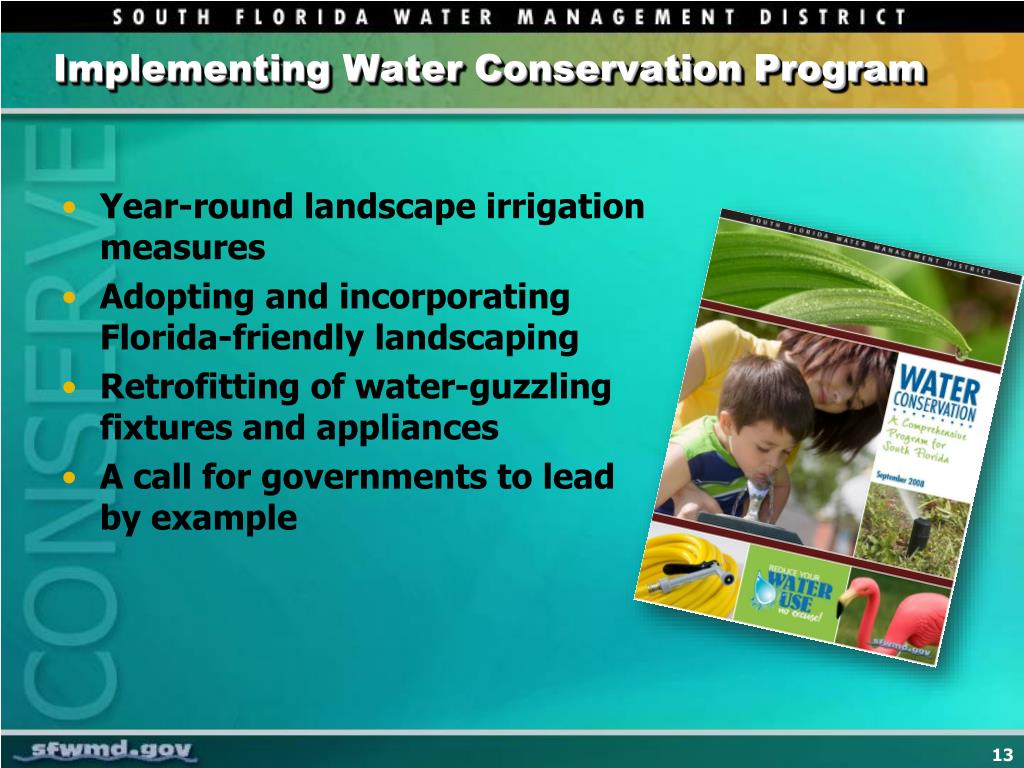 Implementing Water Conservation Program • Year-round landscape irrigation measures • Adopting and incorporating Florida-friendly landscaping • Retrofitting of water-guzzling fixtures and appliances • A call for governments to lead by example