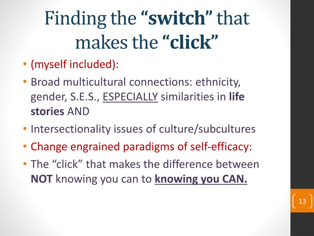 Finding the “switch” that makes the “click” • (myself included): • Broad multicultural connections: ethnicity, gender, S.E.S., ESPECIALLY similarities in life stories AND • Intersectionality issues of culture/subcultures • Change engrained paradigms of self-efficacy: • The “click” that makes the difference between NOT knowing you can to knowing you CAN.
