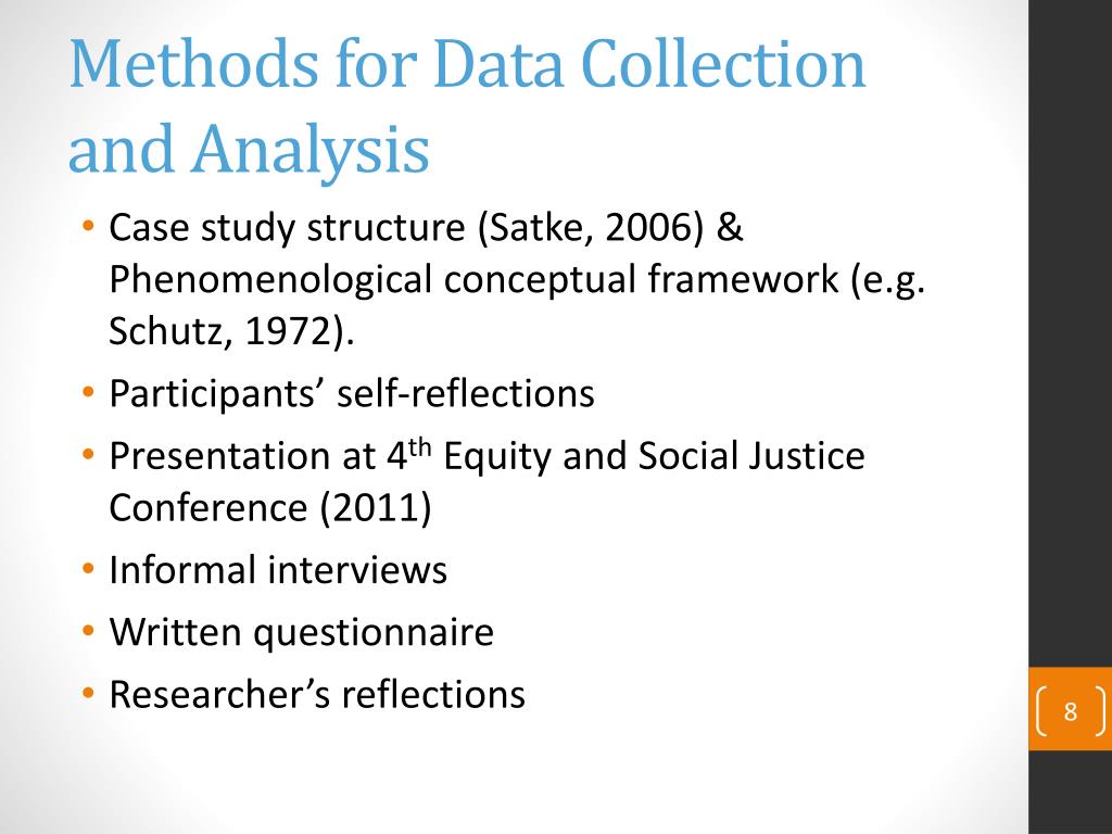 Methods for Data Collection and Analysis • Case study structure (Satke, 2006) & Phenomenological conceptual framework (e.g. Schutz, 1972). • Participants’ self-reflections • Presentation at 4th Equity and Social Justice Conference (2011) • Informal interviews • Written questionnaire • Researcher’s reflections