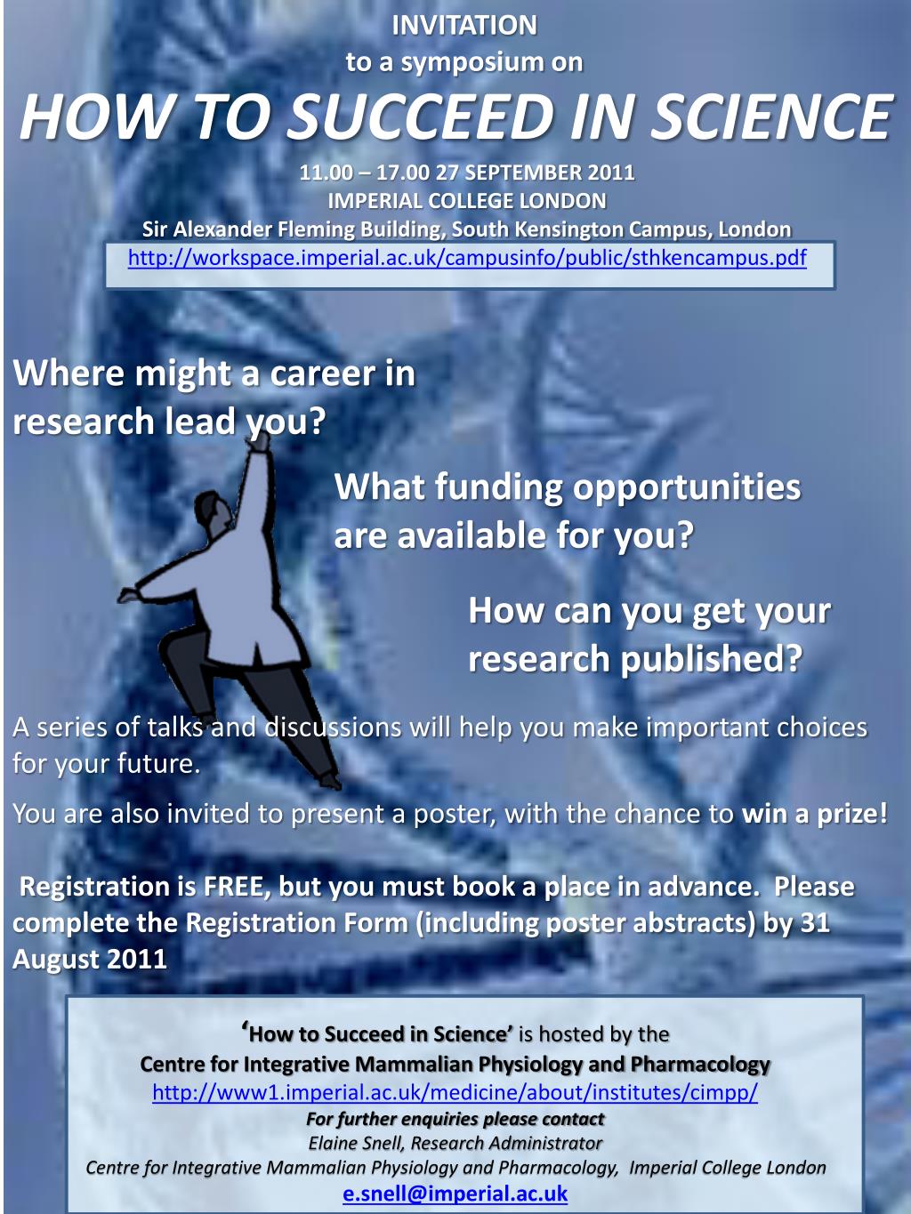 INVITATION to a symposium on. HOW TO SUCCEED IN SCIENCE. 11.00 – 17.00 27 SEPTEMBER 2011 IMPERIAL COLLEGE LONDON Sir Alexander Fleming Building, South Kensington Campus, London http://workspace.imperial.ac.uk/campusinfo/public/sthkencampus.pdf.