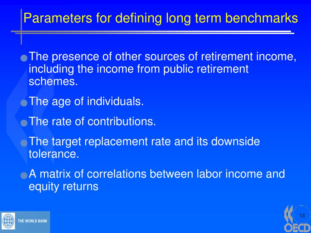 Parameters for defining long term benchmarks • The presence of other sources of retirement income, including the income from public retirement schemes. • The age of individuals. • The rate of contributions. • The target replacement rate and its downside tolerance. • A matrix of correlations between labor income and equity returns 13