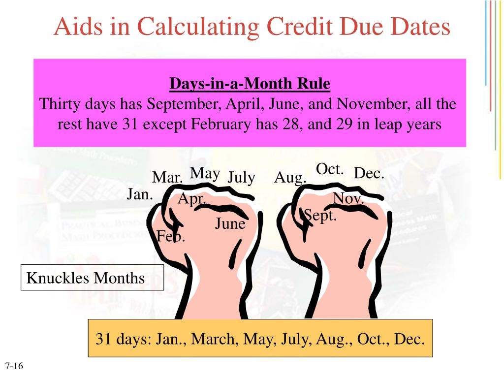 Aids in Calculating Credit Due Dates Oct. May Dec. Mar. July Aug. Jan. Apr. Nov. Sept. June Feb. Knuckles Months 31 days: Jan., March, May, July, Aug., Oct., Dec. Days-in-a-Month Rule Thirty days has September, April, June, and November, all the rest have 31 except February has 28, and 29 in leap years