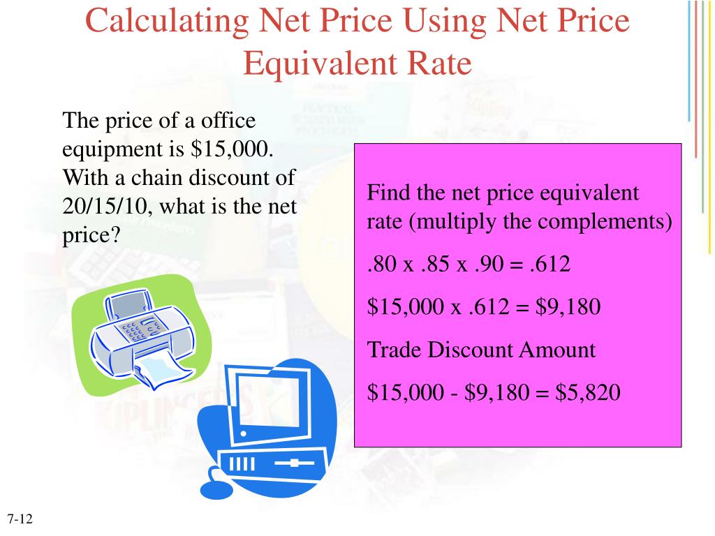 Calculating Net Price Using Net Price Equivalent Rate The price of a office equipment is $15,000. With a chain discount of 20/15/10, what is the net price? Find the net price equivalent rate (multiply the complements) .80 x .85 x .90 = .612 $15,000 x .612 = $9,180 Trade Discount Amount $15,000 - $9,180 = $5,820