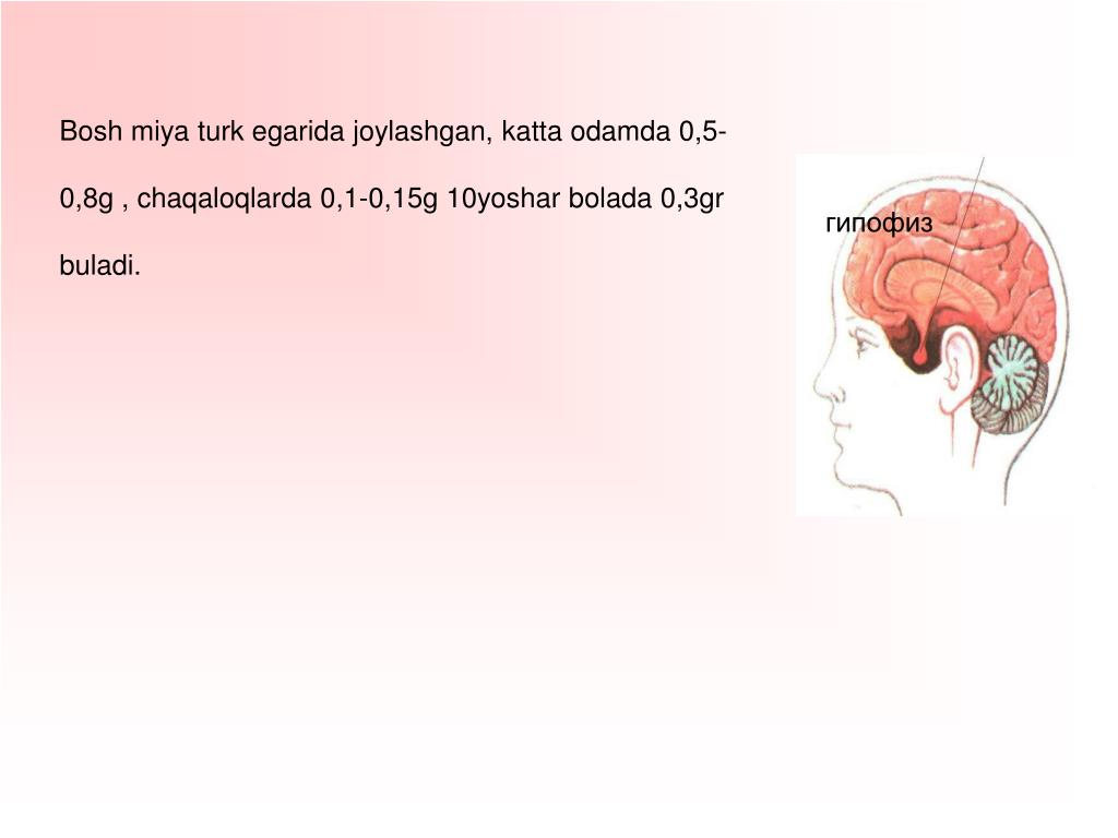 Bosh miya turk egarida joylashgan, katta odamda 0,5-0,8g , chaqaloqlarda 0,1-0,15g 10yoshar bolada 0,3gr buladi. гипофиз
