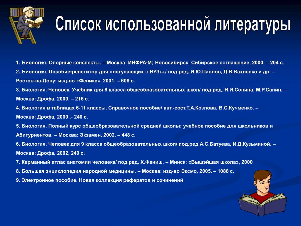 Список использованной литературы • Биология. Опорные конспекты. – Москва: ИНФРА-М; Новосибирск: Сибирское соглашение, 2000. – 204 с. • Биология. Пособие-репетитор для поступающих в ВУЗы./ под ред. И.Ю.Павлов, Д.В.Вахненко и др. – • Ростов-на-Дону: изд-во «Феникс», 2001. – 608 с. • 3. Биология. Человек. Учебник для 8 класса общеобразовательных школ/ под ред. Н.И.Сонина, М.Р.Сапин. – • Москва: Дрофа, 2000. – 216 с. • 4. Биология в таблицах 6-11 классы. Справочное пособие/ авт.-сост.Т.А.Козлова, В.С.Кучменко. – • Москва: Дрофа, 2000 .- 240 с. • 5. Биология. Полный курс общеобразовательной средней школы: учебное пособие для школьников и • Абитуриентов. – Москва: Экзамен, 2002. – 448 с. • 6. Биология. Человек для 9 класса общеобразовательных школ/ под.ред А.С.Батуева, И.Д.Кузьминой. – • Москва: Дрофа, 2002, 240 с. • 7. Карманный атлас анатомии человека/ под.ред. Х.Фениш. – Минск: «Вышэйшая школа», 2000 • 8. Большая энциклопедия народной медицины. – Москва: изд-во Эксмо, 2005. – 1088 с. • 9. Электронное пособие. Новая коллекция рефератов и сочинений