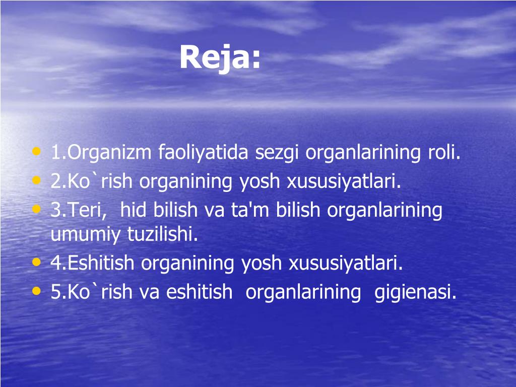 Rеja: • 1.Organizm faoliyatida sеzgi organlarining roli. • 2.Ko`rish organining yosh xususiyatlari. • 3.Tеri, hid bilish va ta'm bilish organlarining umumiy tuzilishi. • 4.Eshitish organining yosh xususiyatlari. • 5.Ko`rish va eshitish organlarining gigiеnasi.