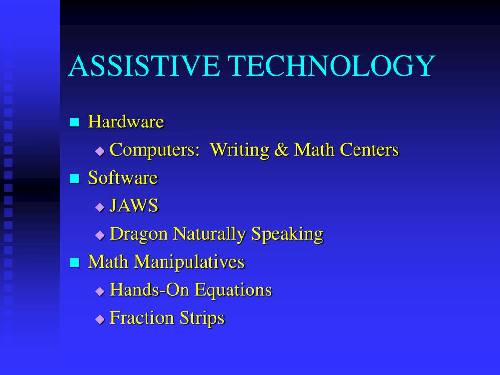ASSISTIVE TECHNOLOGY • Hardware • Computers: Writing & Math Centers • Software • JAWS • Dragon Naturally Speaking • Math Manipulatives • Hands-On Equations • Fraction Strips