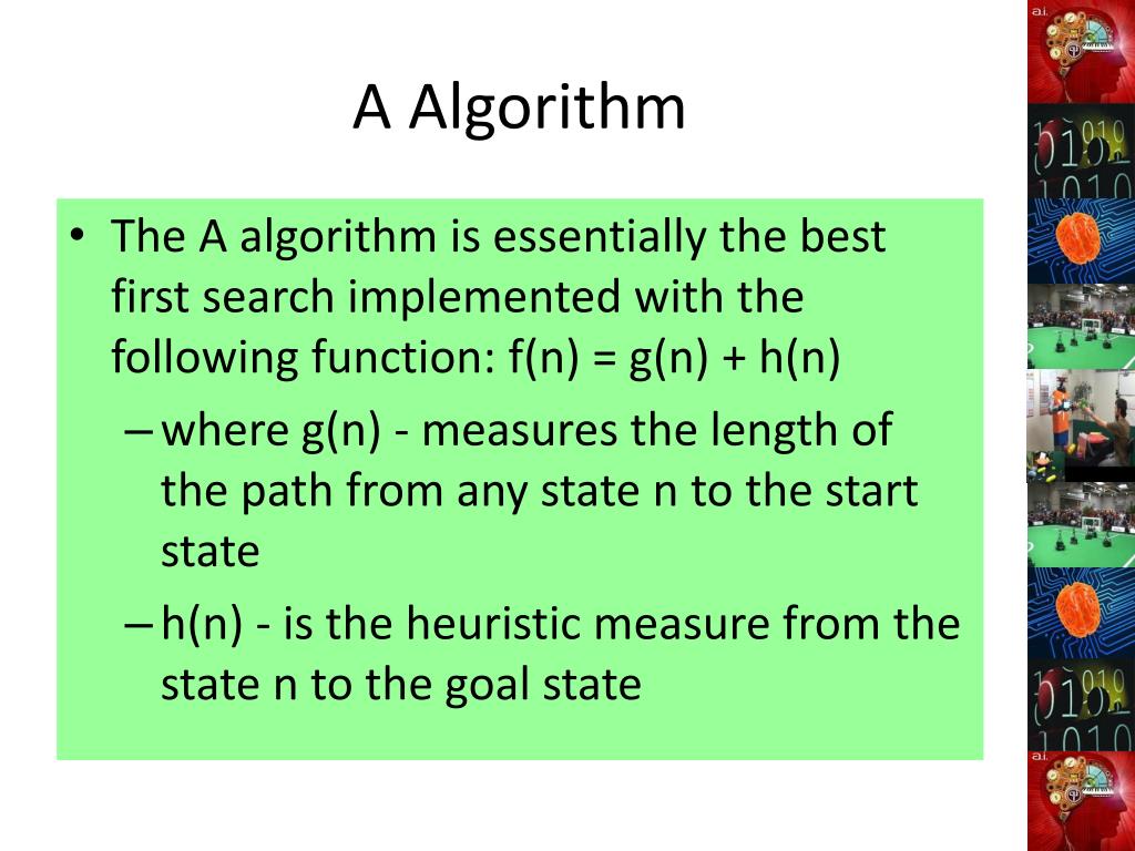 A Algorithm • The A algorithm is essentially the best first search implemented with the following function: f(n) = g(n) + h(n) • where g(n) - measures the length of the path from any state n to the start state • h(n) - is the heuristic measure from the state n to the goal state