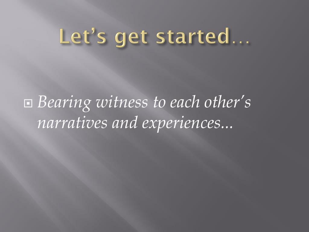 Let’s get started… • Bearing witness to each other’s narratives and experiences...