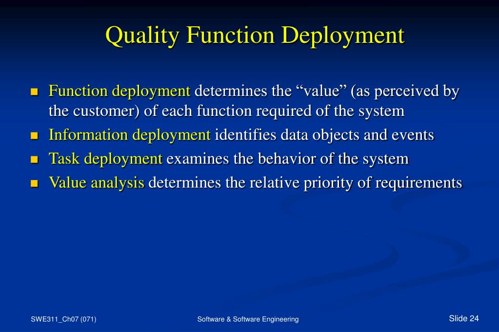Quality Function Deployment • Function deployment determines the “value” (as perceived by the customer) of each function required of the system • Information deployment identifies data objects and events • Task deployment examines the behavior of the system • Value analysis determines the relative priority of requirements SWE311_Ch07 (071) Software & Software Engineering