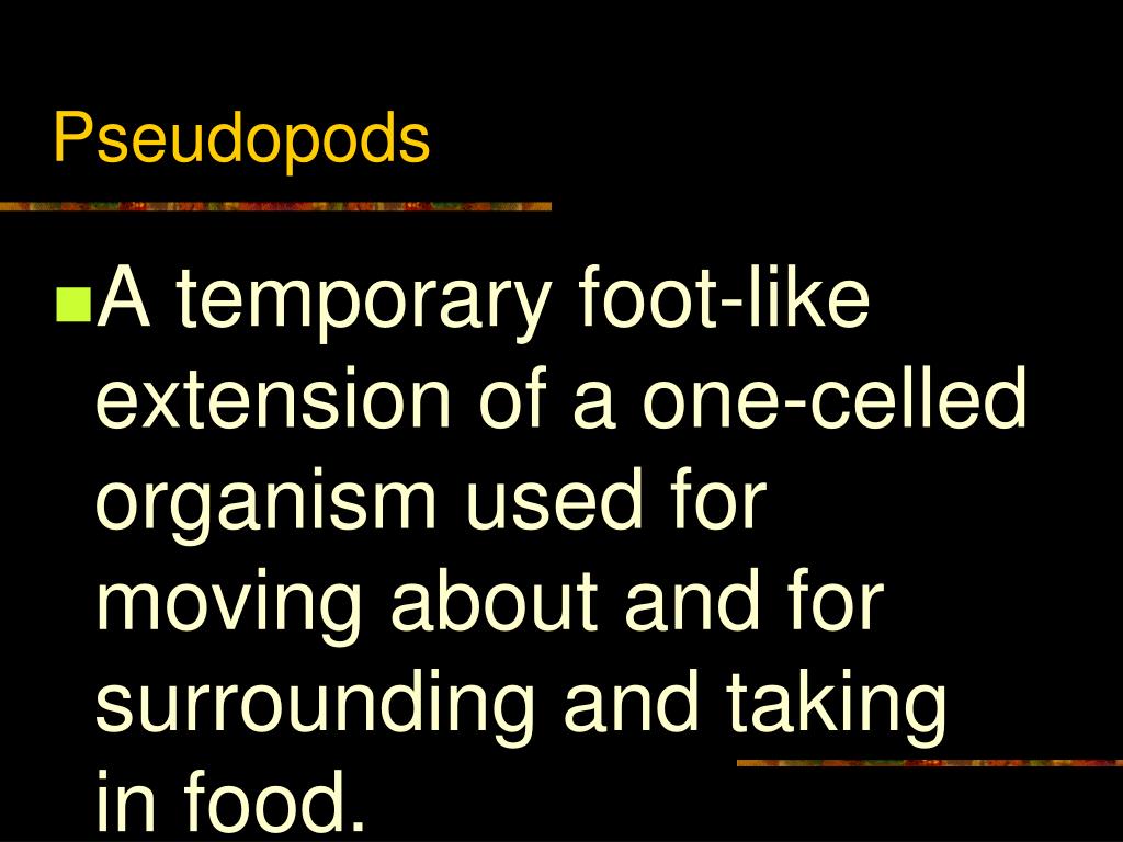 Pseudopods • A temporary foot-like extension of a one-celled organism used for moving about and for surrounding and taking in food.