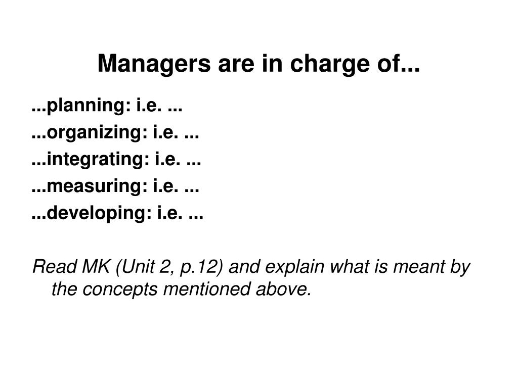 Managers are in charge of... ...planning: i.e. ... ...organizing: i.e. ... ...integrating: i.e. ... ...measuring: i.e. ... ...developing: i.e. ... Read MK (Unit 2, p.12) and explain what is meant by the concepts mentioned above.