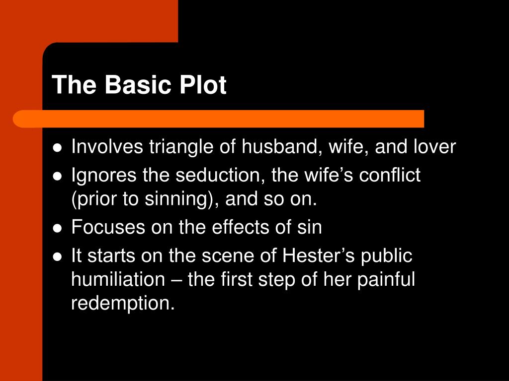 The Basic Plot • Involves triangle of husband, wife, and lover • Ignores the seduction, the wife’s conflict (prior to sinning), and so on. • Focuses on the effects of sin • It starts on the scene of Hester’s public humiliation – the first step of her painful redemption.