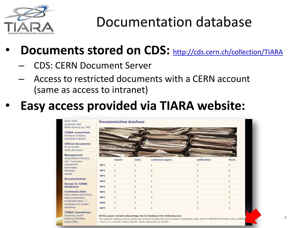 How to access documents (reminder) • Restricted documents : Access with a CERN account or external lightweight account (also used to access the intranet)Account management: https://www.cern.ch/cernaccount/RegisterAccount.aspx On public websitehttp://www.eu-tiara.eu/database C. Tanguy (CEA), 25/11/2013 On CERN Document Server (CDS)http://cdsweb.cern.ch/collection/TIARA