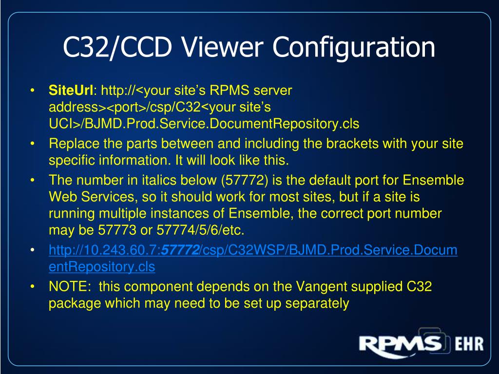 C32/CCD Viewer Configuration • SiteUrl: http://<your site’s RPMS server address><port>/csp/C32<your site’s UCI>/BJMD.Prod.Service.DocumentRepository.cls • Replace the parts between and including the brackets with your site specific information. It will look like this. • The number in italics below (57772) is the default port for Ensemble Web Services, so it should work for most sites, but if a site is running multiple instances of Ensemble, the correct port number may be 57773 or 57774/5/6/etc. • http://10.243.60.7:57772/csp/C32WSP/BJMD.Prod.Service.DocumentRepository.cls • NOTE: this component depends on the Vangent supplied C32 package which may need to be set up separately