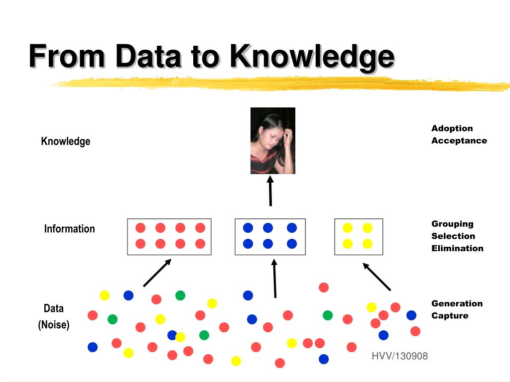 From Data to Knowledge Adoption Acceptance Knowledge Grouping Selection Elimination Information Generation Capture Data (Noise)