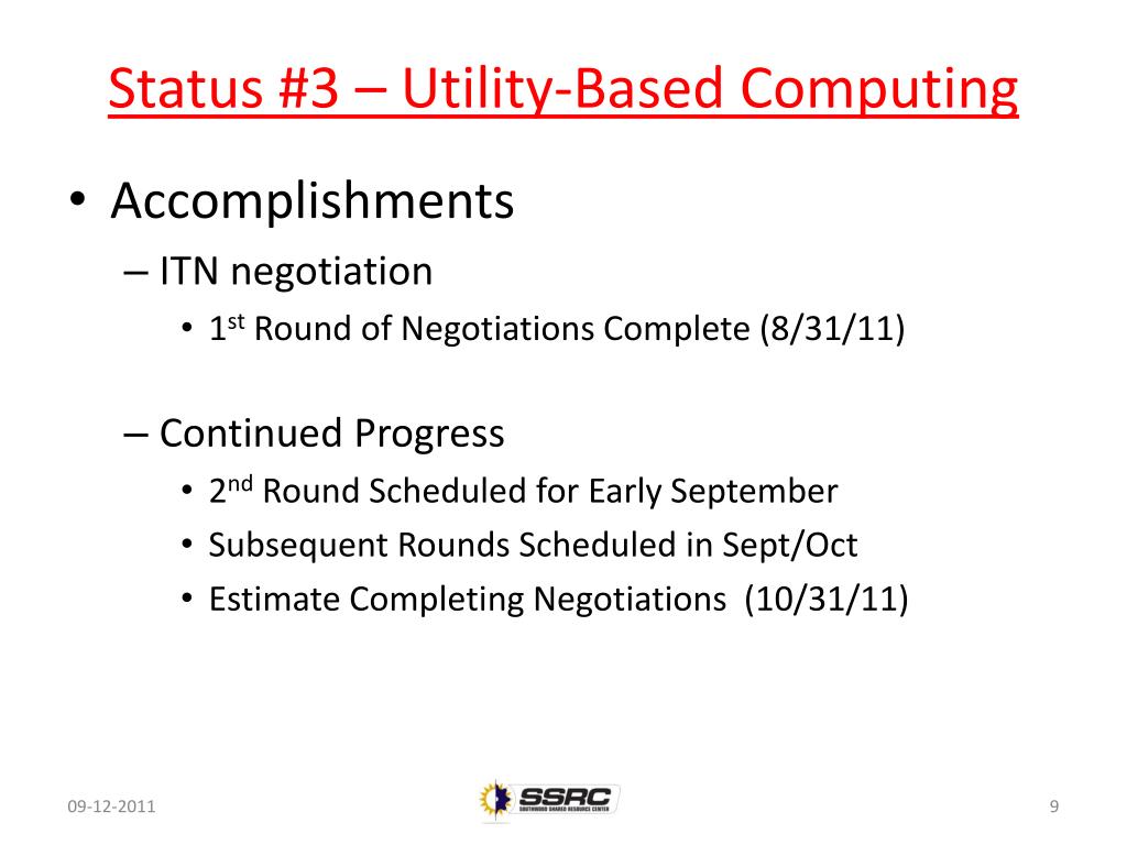 Status #3 – Utility-Based Computing • Accomplishments • ITN negotiation • 1st Round of Negotiations Complete (8/31/11) • Continued Progress • 2nd Round Scheduled for Early September • Subsequent Rounds Scheduled in Sept/Oct • Estimate Completing Negotiations (10/31/11)