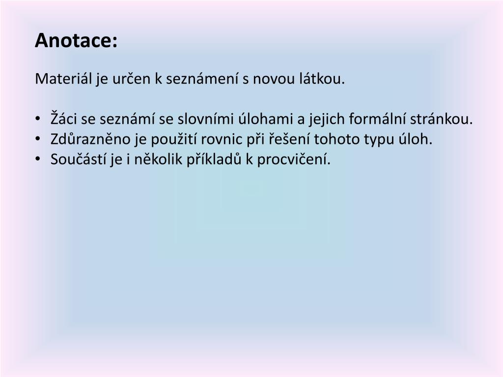 Anotace: • Materiál je určen k seznámení s novou látkou. • Žáci se seznámí se slovními úlohami a jejich formální stránkou. • Zdůrazněno je použití rovnic při řešení tohoto typu úloh. • Součástí je i několik příkladů k procvičení.