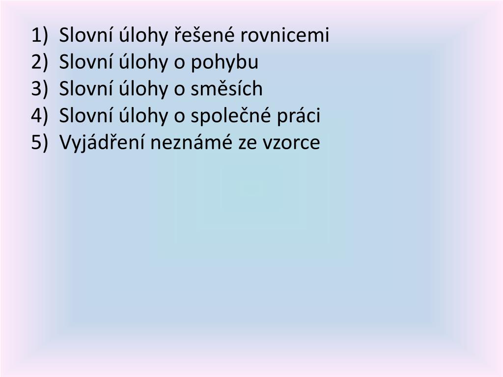 Slovní úlohy řešené rovnicemi • Slovní úlohy o pohybu • Slovní úlohy o směsích • Slovní úlohy o společné práci • Vyjádření neznámé ze vzorce