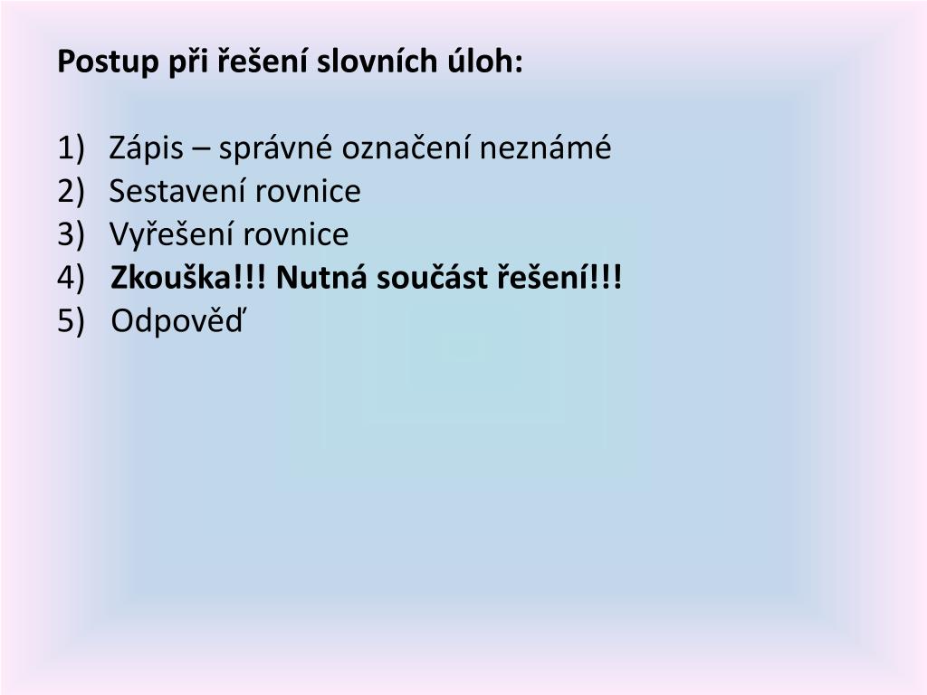 Postup při řešení slovních úloh: • Zápis – správné označení neznámé • Sestavení rovnice • Vyřešení rovnice • 4) Zkouška!!! Nutná součást řešení!!! • 5) Odpověď