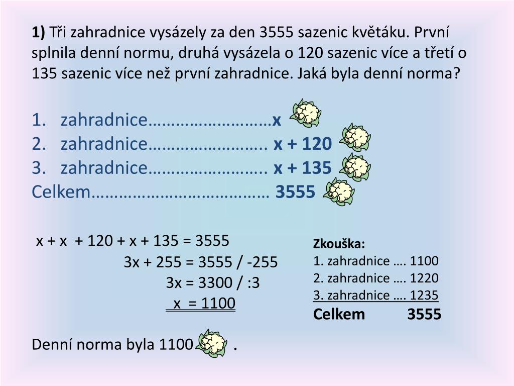 1) Tři zahradnice vysázely za den 3555 sazenic květáku. První splnila denní normu, druhá vysázela o 120 sazenic více a třetí o 135 sazenic více než první zahradnice. Jaká byla denní norma? • zahradnice………………………x • zahradnice…………………….. x + 120 • zahradnice…………………….. x + 135 • Celkem………………………………… 3555 • x + x + 120 + x + 135 = 3555 • 3x + 255 = 3555 / -255 • 3x = 3300 / :3 • x = 1100 • Denní norma byla 1100 Zkouška: 1. zahradnice …. 1100 2. zahradnice …. 1220 3. zahradnice …. 1235 Celkem3555 .