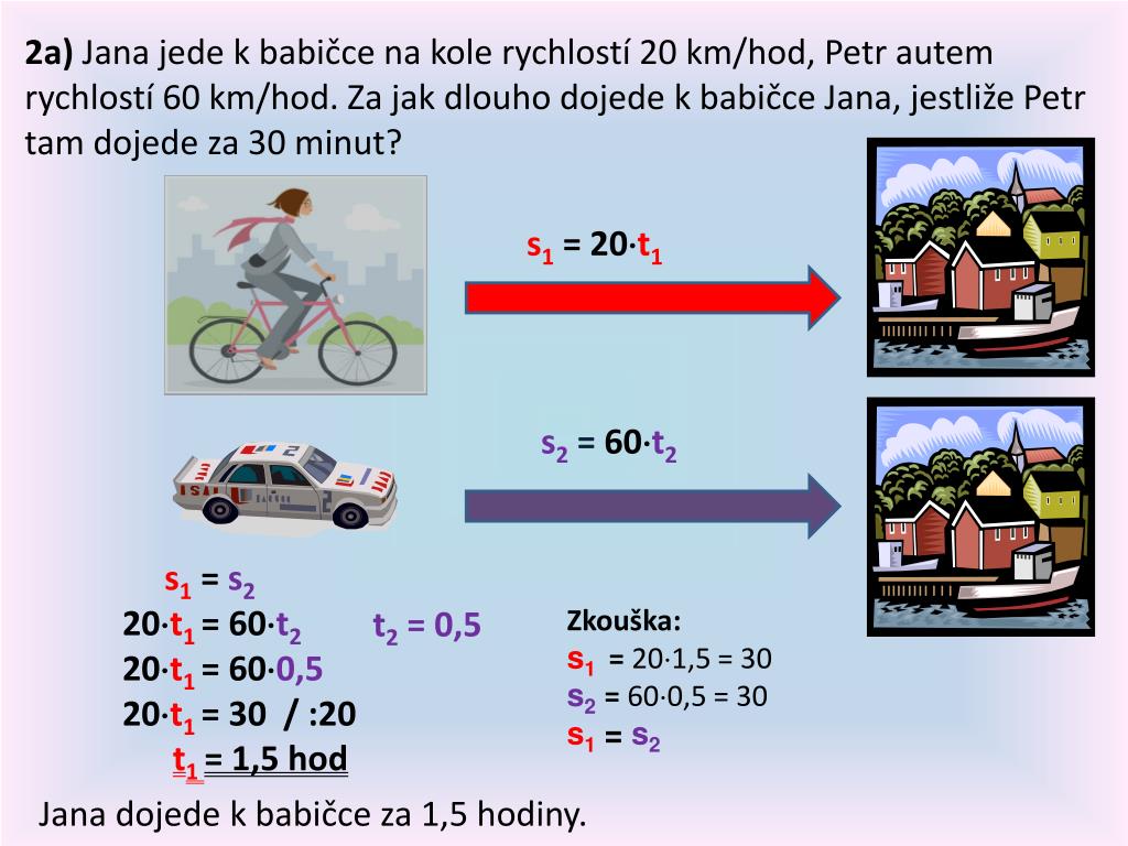 2a) Jana jede k babičce na kole rychlostí 20 km/hod, Petr autem rychlostí 60 km/hod. Za jak dlouho dojede k babičce Jana, jestliže Petr tam dojede za 30 minut? s1=20t1 s2 = 60t2 s1=s2 20t1 =60t2 20t1 =600,5 20t1 =30 / :20 t1 = 1,5 hod t2 = 0,5 Zkouška: s1 = 201,5 = 30 s2= 600,5 = 30 s1=s2 Jana dojede k babičce za 1,5 hodiny.