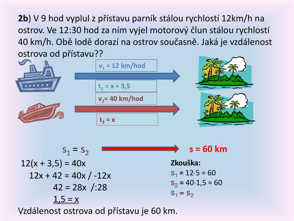 2b) V 9 hod vyplul z přístavu parník stálou rychlostí 12km/h na ostrov. Ve 12:30 hod za ním vyjel motorový člun stálou rychlostí 40 km/h. Obě lodě dorazí na ostrov současně. Jaká je vzdálenost ostrova od přístavu?? s1 = s2 12(x + 3,5) = 40x 12x + 42 = 40x / -12x 42 = 28x /:28 1,5 = x Vzdálenost ostrova od přístavu je 60 km. v1 = 12 km/hod t1 = x + 3,5 v2= 40 km/hod t2 = x s = 60 km Zkouška: s1 = 125 = 60 s2= 401,5 = 60 s1 = s2