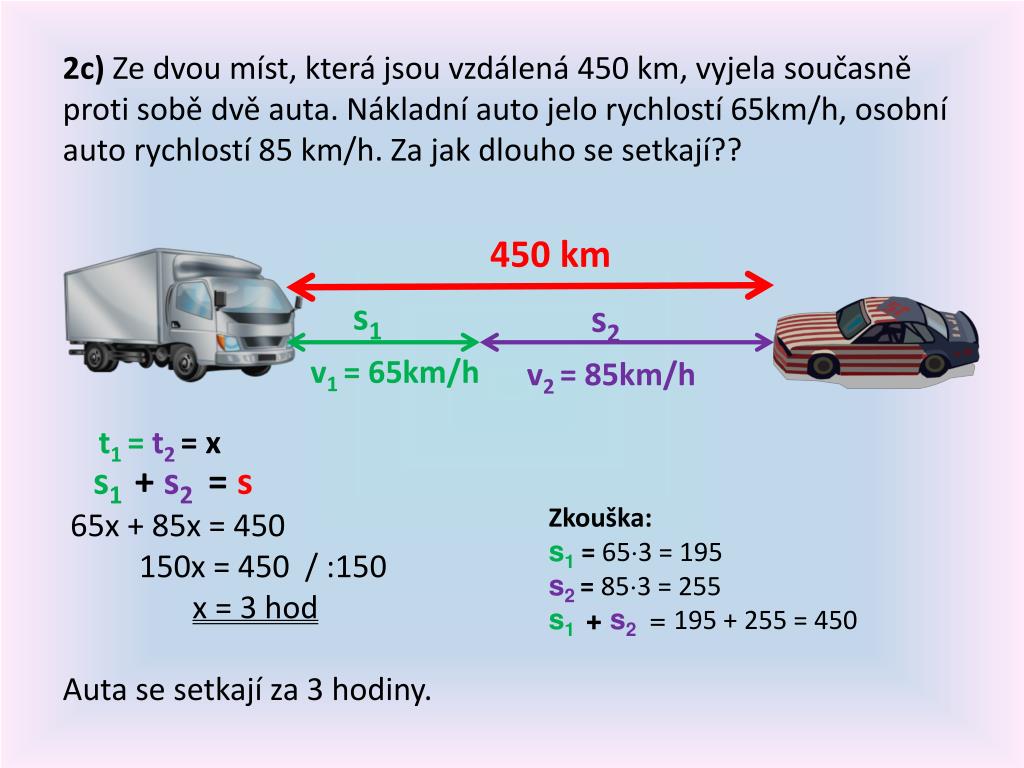 2c) Ze dvou míst, která jsou vzdálená 450 km, vyjela současně proti sobě dvě auta. Nákladní auto jelo rychlostí 65km/h, osobní auto rychlostí 85 km/h. Za jak dlouho se setkají?? s1 + s2 = s 65x + 85x = 450 150x = 450 / :150 x = 3 hod Auta se setkají za 3 hodiny. 450 km s1 s2 v1 = 65km/h v2= 85km/h t1 = t2 = x Zkouška: s1= 653 = 195 s2 = 853 = 255 s1 + s2 = 195 + 255 = 450