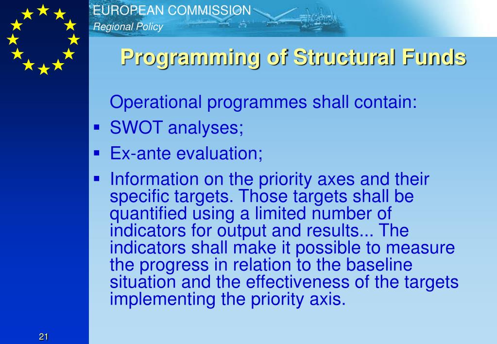 Programming of Structural Funds Operational programmes shall contain: • SWOT analyses; • Ex-ante evaluation; • Information on the priority axes and their specific targets. Those targets shall be quantified using a limited number of indicators for output and results... The indicators shall make it possible to measure the progress in relation to the baseline situation and the effectiveness of the targets implementing the priority axis.