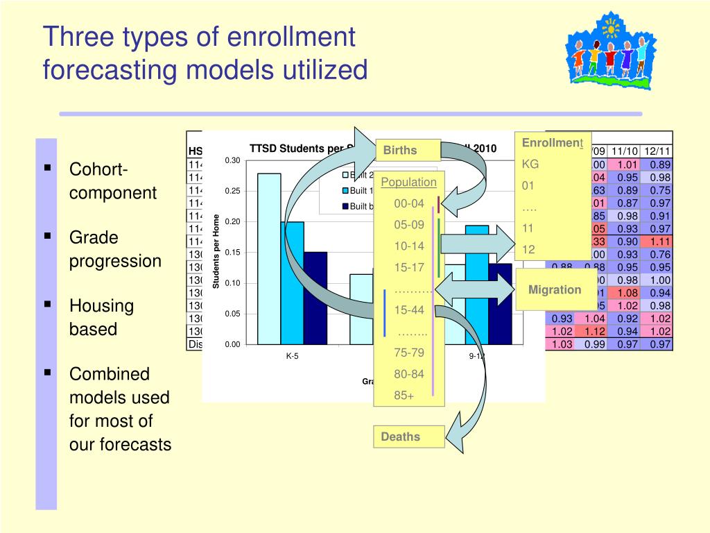 Population 00-04 05-09 10-14 15-17 ………. 15-44 …….. 75-79 80-84 85+ Three types of enrollment forecasting models utilized • Cohort-component • Grade progression • Housing based • Combined models used for most of our forecasts Enrollment KG 01 …. 11 12 Births Migration Deaths