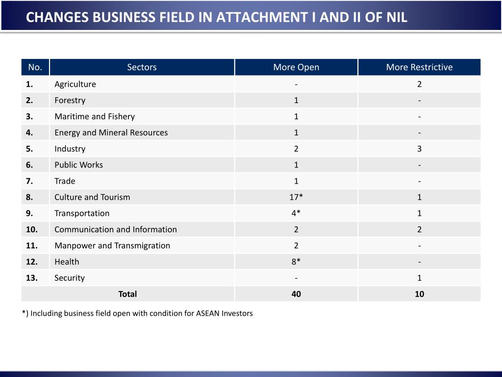 CHANGES BUSINESS FIELD IN ATTACHMENT I AND II OF NIL *) Including business field open with condition for ASEAN Investors