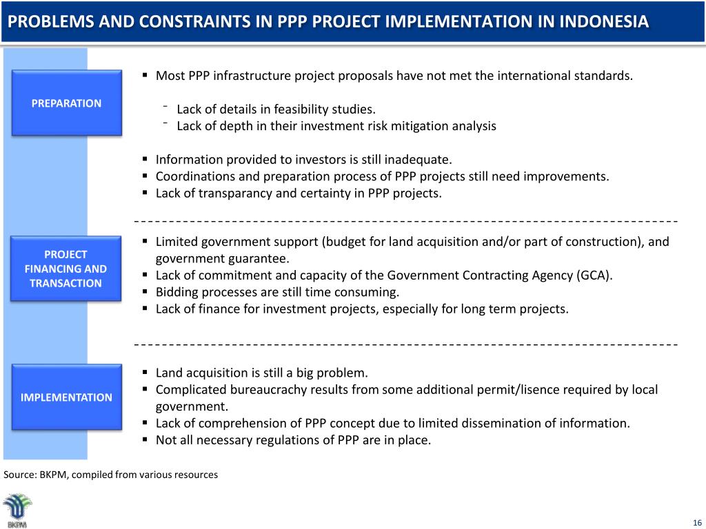 PROBLEMS AND CONSTRAINTS IN PPP PROJECT IMPLEMENTATION IN INDONESIA PREPARATION PROJECT FINANCING AND TRANSACTION IMPLEMENTATION Source: BKPM, compiled from various resources