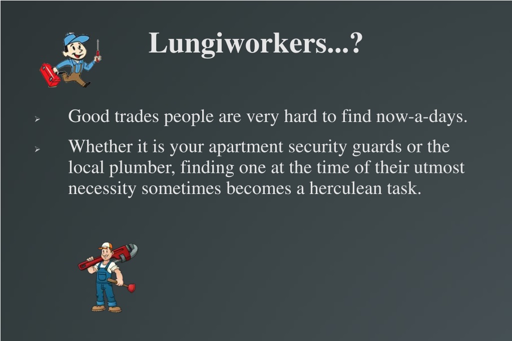 Lungiworkers...? • Good trades people are very hard to find now-a-days. • Whether it is your apartment security guards or the local plumber, finding one at the time of their utmost necessity sometimes becomes a herculean task.