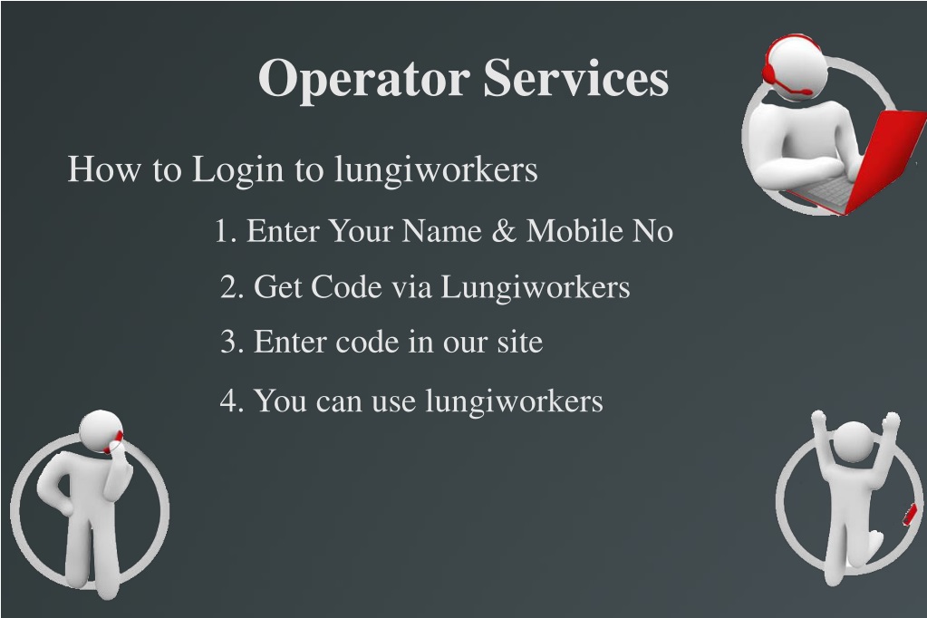 Operator Services How to Login to lungiworkers 1. Enter Your Name & Mobile No 2. Get Code via Lungiworkers 3. Enter code in our site 4. You can use lungiworkers